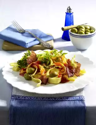Fry the ham for 2-3 minutes until crispy. Add the frisée and olives to the sauce, bring to the boil again briefly, season with salt, pepper and a little sugar. Drain the pasta and arrange on plates with sauce and ham.