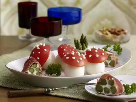 Make 3 rolls in this way. For the toadstools, boil eggs in boiling water for about 10 minutes. In the meantime clean and wash the tomatoes and cut off the lid. Wash the rest of the tomatoes in another way (e.g.