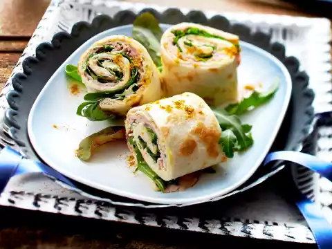 Spread about half the rocket evenly on top. Roll up the flat cakes tightly and cut them into about 6 pieces. Spread the rest of the rocket on plates. Arrange ham rolls on top.