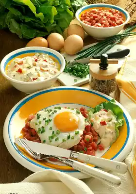 Heat the remaining fat in a pan and fry the eggs in it. Season with salt and pepper. Put fried eggs on the ham and sprinkle with chives. Wash the salad, dab dry and place on the plates with some sauce. Serve the rest of the sauce with it