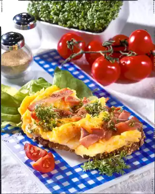 Whisk eggs and milk and season with salt. Cut ham into strips and fold into the eggs. Heat 10 g of fat in a small pan and let the scrambled eggs fry in it at medium heat.