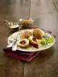 Garnish the terrine with remaining pistachios, parsley and juniper berries. Put the lid on and place in the oven in a hot water bath. Cook for about 11/4 hour. Let the terrine cool down, drain the meat stock and let the terrine cool down completely. In the meantime soak the gelatine in cold water. Mix the veal stock with the remaining sherry and vinegar. Squeeze out the gelatine, dissolve in a saucepan over low heat and add the veal stock while stirring. Pour the jelly stock over the terrine and pour the remaining stock into a small bowl. Allow to set. Cut terrine into 8-10 slices and arrange on plates. Turn out remaining jelly and dice finely. Cut pears in half, cut out the core with a ball cutter and fill pears with cranberries. Distribute on the plates. Sprinkle tureen with jelly cubes and pistachios as desired. Serve garnished with parsley. Serve with fresh baguette