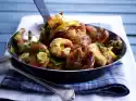 Cut potatoes into slices. Heat 1 tablespoon of fat in a large frying pan. Leave the bacon cubes out at medium heat. Add potato slices and fry until crispy for about 10 minutes. Cut the fish into bite-sized pieces. Slide potato slices to the edge. Melt 1 tablespoon of fat in the pan. Sauté the onion in it. Add the fish and mix with the potatoes. Stir mustard and cream until smooth, pour into the pan. Cover and leave to stand for 5-10 minutes.
