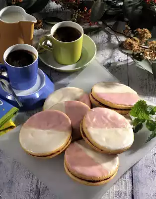 Mix icing sugar and lemon juice. Warm the remaining jelly also while stirring and stir into one half of the icing sugar icing. Spread one surface half of each cookie with white icing sugar, the other half with pink icing sugar.