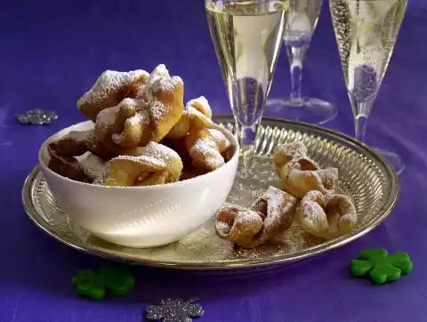 Cut out rectangles (7 x 4 cm) with a cookie cutter. Cut approx. 5.5 cm into each rectangle in the middle. Pull one end of the dough through the slit. Heat the oil in a wide saucepan. Fry 5 bows in the hot oil until golden brown.