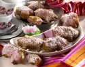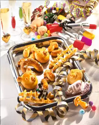 Stir egg yolk and 1 tablespoon of water until smooth. Spread the dough pieces with it and put them together to form piglets and ladders. Spread the pastry with egg yolk. Sprinkle with sugar crystals. Place on a baking tray lined with baking paper and bake in a preheated oven (electric range: 200 °C/ gas: level 3) for approx. 15 minutes