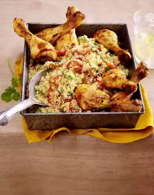 Season to taste with salt and pepper. Take the legs out of the oven. Serve the couscous and place the chicken legs on top.