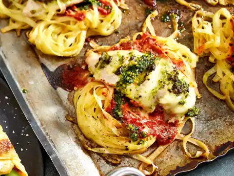 Mix the pasta in a bowl with 2 tablespoons of oil and parmesan, place them side by side to form 4 nests on the baking tray. Add some sauce to each nest. Place the fillets on top. Bake in a hot oven for 15-20 minutes.