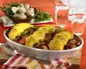 Clean and wash the Brussels sprouts and cook them in the broth for about 15-20 minutes. In the meantime peel, wash and halve the potatoes. Cook in boiling salted water for about 15 minutes and drain.