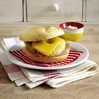 Drain the pineapple well. Cut the bread roll open and brush with butter. Cover lower halves with ham, escalopes, pineapple and cheese. Bake in a hot oven (electric cooker: 220 °C/circulating air: 200 °C/gas: level 4) for approx. 3 minutes until the cheese has melted.