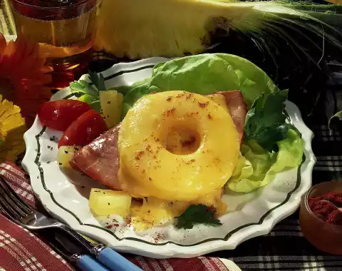 Roast slices of toast and spread with fat. Place 1 slice of ham, 1 slice of pineapple and 1 slice of cheese sprinkled with paprika on the bread. Place on a baking tray lined with baking paper and bake in a preheated oven (electric range: 200 °C / gas: level 3) for approx. 15 minutes. In the meantime, cut the remaining pineapple slice into pieces. Wash, clean and slice the tomato. Arrange bread on a plate, as desired with lettuce leaves and serve with pineapple pieces and tomato slices sprinkled with pepper