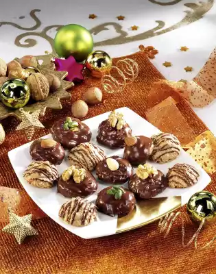 Spray small heaps (3-4 cm Ø) on 2 baking trays lined with baking paper. Bake one after the other in a preheated oven (electric oven: 175 °C/ gas: level 2) for 15-20 minutes, then allow to cool. For decoration, chop the chocolate coating and melt it on a hot water bath. Cover the kusserln completely or decorate them with fine threads as desired. Cover cookies with various nuts before the chocolate coating becomes firm