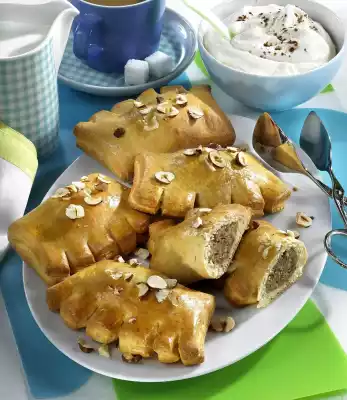 Roll out the dough to a rectangle (approx. 50 x 20 cm). First cut the rectangle in half lengthwise, then cut each half into 5 squares (approx. 10 x 10 cm). Put some nut mixture in the middle of each of the dough squares. Brush the edges of the dough with egg white. Fold the squares over to form a pocket, press the edges well down. Cut the long side several times to a depth of about 1 cm. Place nut pockets on a baking tray lined with baking paper. Brush with remaining egg white and sprinkle with 20 g nut flakes. Bake in a preheated oven (electric cooker: 175 °C / fan-assisted oven: 150 °C / gas: level 2) for 20-25 minutes.