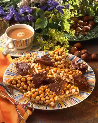 Stir in the fat. Add eight tablespoons of water and mix to a creamy mixture. Fold in nuts and spread evenly on the base. Allow to set and cut into triangles. Chop the chocolate coating and melt in a hot water bath.