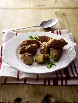 First pull the croquettes through the egg mass, then turn them in the hazelnuts. Press the hazelnuts a little bit and form croquettes. Heat plenty of oil (approx. 1 fingerbreadth) in a large pan. Fry the croquettes in it in 2 portions for 6-8 minutes, turning constantly. Arrange the croquettes and garnish with parsley