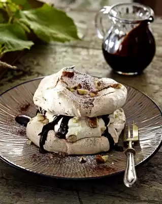 Let the meringue cool completely. Whip the cream until stiff, while pouring in 2 tablespoons of sugar. Spread the cream over half of the meringue. Drizzle with chocolate sauce. Place the remaining meringue on top. Sprinkle the rest with nuts, dust with cocoa and icing sugar
