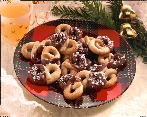 Then let them cool down on a cake rack. Chop the chocolate coating and melt on a hot water bath. Dip the pretzels halfway into the chocolate coating. Sprinkle the sugar crystals on the still moist chocolate. Leave to dry. Keep cool in well closed tins