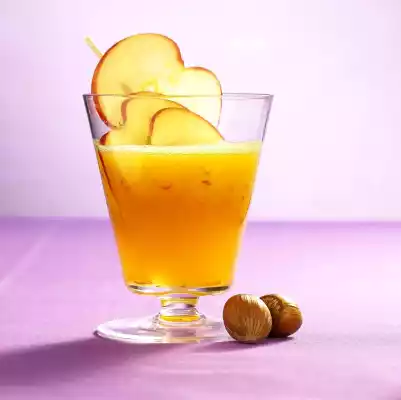 Peel halves, dice flesh. Pour peach pulp, apple and peach juice and hazelnuts into the blender and puree. Put apple slices on skewers. Decorate glasses with them