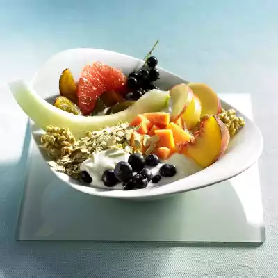 Cut the fruit flesh into slices. Wash and drain the currants. Wash the apple, quarter it and cut out the core. Cut quarter into slices. Remove seeds from papaya, peel and dice.