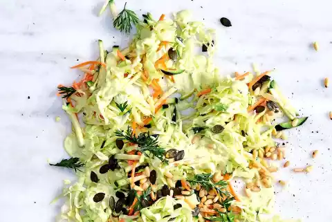 For the salad, clean and wash the pointed cabbage, cut in half lengthwise and remove the stalk. Cut the cabbage into fine strips and place in a large bowl. 1⁄2 Add 1 tsp salt, 1 tsp sugar and 1 tbsp lemon juice. Knead the cabbage well.
