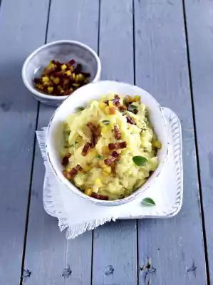 Heat milk and butter in a pot. Drain the potatoes, add the milk mixture and mash them with a potato masher until mashed. Season to taste with salt, marjoram and nutmeg. Arrange the puree and sprinkle with apple bacon