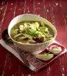 From the remaining soup vegetables, cut the leek into strips and the celery into small cubes. Remove the leg slices from the stock. Pour stock through a sieve (with gauze cloth). Bring to the boil again, reduce heat, add vegetables and simmer in the stock for 8-10 minutes. Remove meat from the bone, cut into large pieces, warm up briefly in the hot stock with semolina dumplings. Season the soup with salt, pepper and a little sugar and arrange in plates with some fried peas.