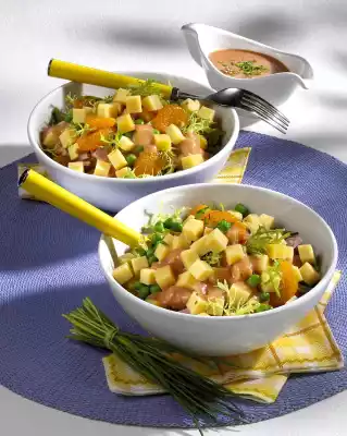 Mix the prepared ingredients and arrange in portions in bowls. For the sauce, peel and chop the onion. Wash the chives and cut into small rolls. Mix onion, chives, ketchup, mayonnaise and 100 ml mandarin juice.