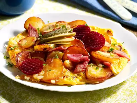 Whisk egg and milk. Season with salt, pepper and paprika and pour over the potatoes. Leave to stand over medium heat. Cut cucumber into slices and arrange on the farmer's breakfast. Garnish with beetroot and parsley