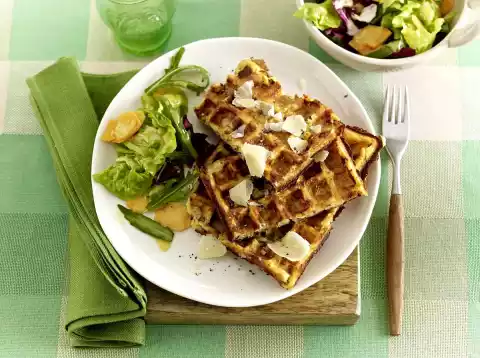 Finely grate the potatoes. Mix potatoes, tomatoes, herbs, remaining onion cubes, milk and egg and season with salt and pepper. Mix baking powder and flour and stir into the dough. Preheat waffle iron, grease well and bake dough in it until crispy. Arrange the waffles and salad and sprinkle with parmesan