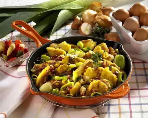 Separate eggs. Mix egg yolk, milk, mineral water and flour to a smooth dough. Season with salt, pepper and nutmeg. Heat 1 tablespoon of oil in a frying pan, fry the onions, leek and ham for 3-4 minutes.