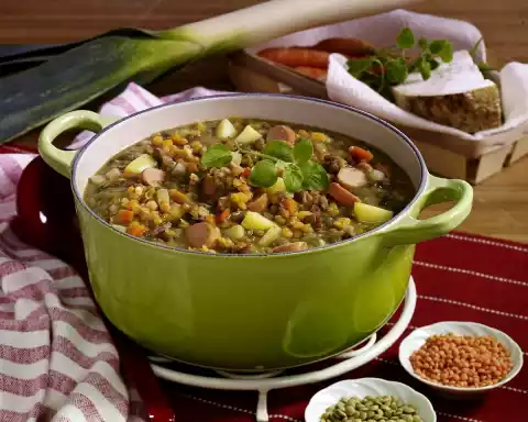 Cook for 45-60 minutes. Clean, peel and dice the celery, carrots and parsley root. Clean the leek, wash thoroughly and cut into cubes. Add vegetables to the lentils. Peel, wash and dice the potatoes.