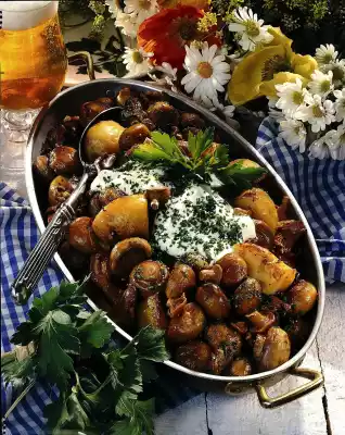 Heat 1-2 tablespoons of oil in a frying pan. Sauté garlic and onion in it. Add the mushrooms and fry for about 6-8 minutes, turning occasionally. Season. Fold in potatoes and parsley. Add crème fraîche and garnish with the rest of the parsley