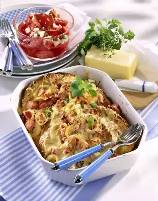 Hard cheeses (e.g. Gruyère, Emmental) are excellent: they melt wonderfully and brown beautifully. Semi-hard cheeses (e.g. Appenzeller, Gouda, Edam) are just as good. Soft cheeses such as Camembert show less browning, but melt well. Mix parmesan with a little cream, otherwise it becomes dry