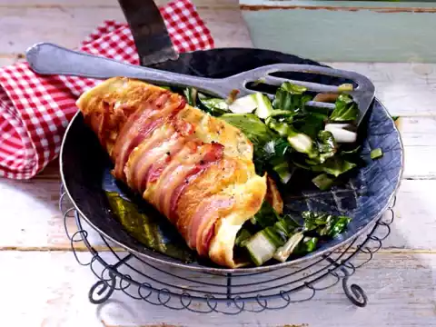 Heat 1 teaspoon of oil in a coated (22 cm Ø) Add 1/8 of the dough and fry over medium heat for 4-5 minutes. Halve the bacon slices crosswise. Lay 4-5 bacon halves flat on the still liquid dough. Turn the pancakes and fry for 3-4 minutes. Remove the finished pancakes and keep warm. Process the remaining dough with 1 teaspoon of oil each in the same way