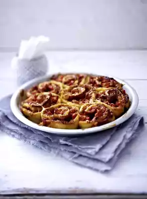 Moisten one long side edge with water. Then roll up the pizza from the opposite long side. Press the edge of the dough well. Cut the pizza roll into approx. 10 thick slices. Grease a pizza tray and dust with flour. Put pizza snails in the form and sprinkle with the remaining cheese. Bake in the preheated oven on the lower shelf (electric oven: 225 °C/ convection oven: 200 °C/ gas: level 4) for approx. 25 minutes