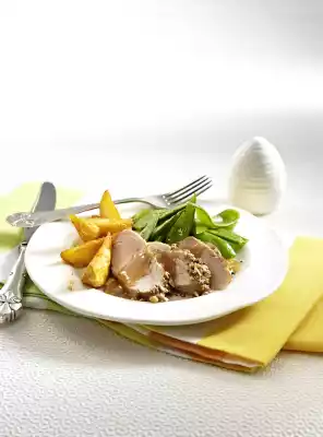 ##Clean, wash and cook in boiling salted water for about 4 minutes. Pour off vegetable water, mix pods with butter. Cut ##meat## into slices and arrange with mangetouts, potato wedges and sauce.