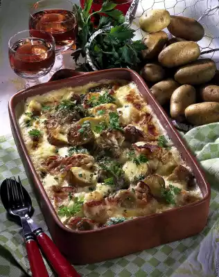 Fill potatoes and cauliflower into an ovenproof casserole dish. Pour sauce over it. Spread bacon on top. Bake in a preheated oven (electric: 200 °C/ gas: level 3) for about 20 minutes. Serve sprinkled with chervil.