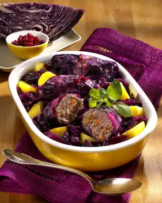 Spread on the red cabbage leaves. Roll up the roulades and pin them with wooden skewers. Heat the oil in a pot. Brown the roulades in it all around, take them out. Put cabbage and bacon into the pot and braise.
