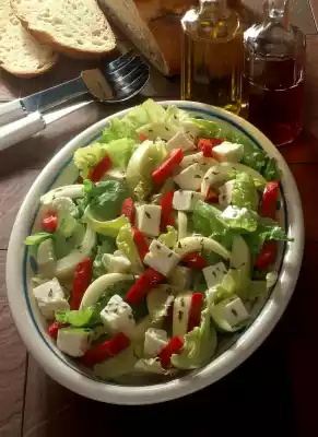 Clean, wash and pluck the salad into bite-sized pieces. Halve, clean, wash, quarter and cut the peppers into strips. Peel, halve and slice the onion. Roughly dice the feta cheese.