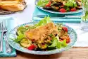 For the salad, mix white wine vinegar and 1 teaspoon sugar. Season with salt and pepper. Stir in 2 tablespoons of oil. Peel, wash and grate the carrot. Clean, wash and chop the peppers. Clean, wash and cut salad into short strips. Wash and chop parsley. Mix the prepared ingredients.