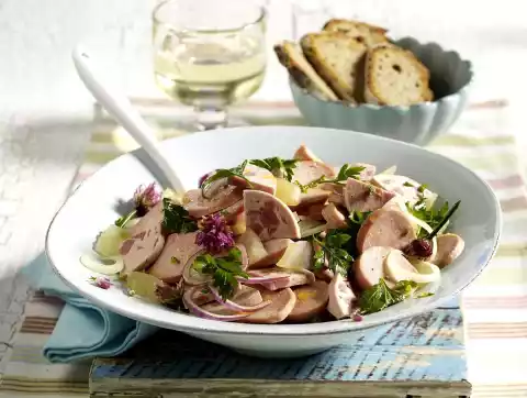 Put sausage, parsley, onion rings and mustard gherkins in a bowl. Add vinegar and oil and mix. Season to taste with salt and pepper and leave to marinate for about 30 minutes. Flavour salad with salt, pepper and vinegar and garnish with chive flowers. Tastes good with farmhouse bread