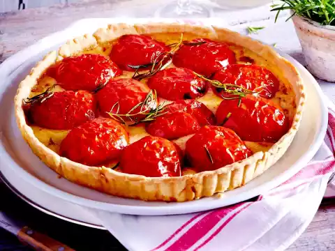 Whisk eggs, milk and cheese together. Season with salt and pepper. Pour cheese cream on the bottom. Spread tomatoes on top and bake in the preheated oven (electric cooker: 200 °C/ convection oven: 175 °C/ gas: see manufacturer) for 20-30 minutes.