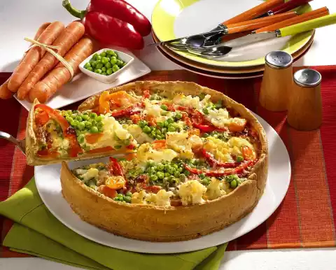 Peel, wash and slice the carrots. Heat the oil in a pot and fry the onion. Add cauliflower, sauté briefly and season lightly with salt and pepper. Pour in broth, bring to the boil and stew covered for about 10 minutes. After about 5 minutes add bell peppers, carrots and peas, mix well and finish cooking in an open pot. Let the vegetables cool down. Grate cheese finely. Roll out the dough on a floured work surface to a circle (approx. 32 cm Ø). Line a greased springform pan (26 cm Ø) with it and press the dough to the edge. Prick the dough base several times with a fork and sprinkle with breadcrumbs. Layer the vegetable filling and 75 g cheese in the form.
