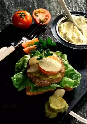 Peel and finely chop the onion. Mix minced meat, diced onion and egg yolk. Season with salt and pepper. Form into 4 meatballs, press flat and grill under the hot grill of the oven for about 5 minutes. Cut tomatoes and gherkins into slices. Drain pearl onions. Cover the meatballs with them. Cut off the cream cheese with teaspoons and place on the tomato slices. Clean and wash the salad and drain well. Toast the slices of bread, let cool down a little and cover with lettuce leaves. Add the meatballs and serve immediately garnished with parsley