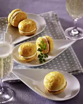 Pour the cheese cream into a piping bag with a small perforated spout. Spray some parmesan cream on about half of the biscuits. Put the rest of the Whoopies on top and press down lightly. Keep cool until serving