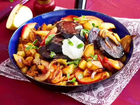 Season the potato pan with salt and pepper. Fold in marjoram, except for something to sprinkle on. Arrange blood sausage slices on top and sprinkle with the remaining marjoram. Possibly serve with crème fraîche.