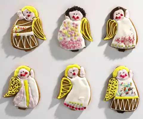 Cover the dough and let it rest for about 1 hour. Halve the dough, roll out in portions on a floured work surface to a thickness of approx. 3 mm. Use a template to cut angels (approx. 11 x 8 cm) from the dough. Place on 2 baking trays lined with baking paper. Bake one after the other in a preheated oven (electric cooker: 200 °C/ convection oven: 175 °C/ gas: level 3) for 8-10 minutes, let cool off. Mix icing sugar and egg white with the whisk of the hand mixer to a smooth glaze. If the icing is too firm, stir in some water. Divide the icing into 1 larger and 3 smaller portions. Colour the smaller portions pink, yellow and brown with food colouring and cocoa. Pour the icing into 1 disposable piping bag each.