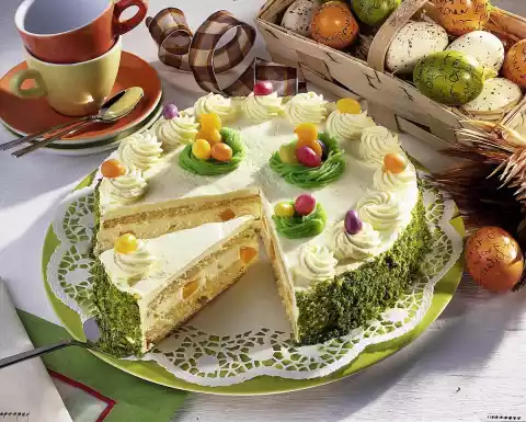 Fold the peaches into half of the buttercream. Halve the cake base and spread the bottom half with the peach cream. Place the second cake base on top and spread the cake with buttercream. Pour the rest of the buttercream into a piping bag with a star nozzle and spray tuffs onto the cake. Sprinkle the cake with ground pistachios. Put the cake in a cool place for about 1 hour. Knead marzipan with food colouring and press it through a garlic press. Form nests of it and decorate the cake with sugar eggs and peach chicks