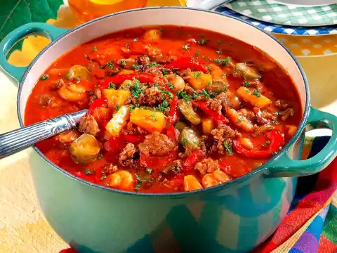 Heat the oil. Fry the onion, minced meat and minced pork in it over a high heat for about 10 minutes, turning it over. Season with salt and pepper. Stir in tomato paste and sweat it. Deglaze with oxtail soup, stock, 150 ml pineapple juice and ketchup and bring to the boil.