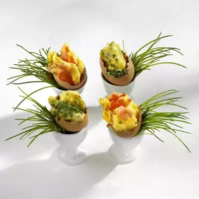 Mix the rest of the scrambled eggs with the herbs. Fry the scrambled eggs in the pan. Fill the scrambled eggs into the egg shells and decorate with chives, cress and trout caviar.